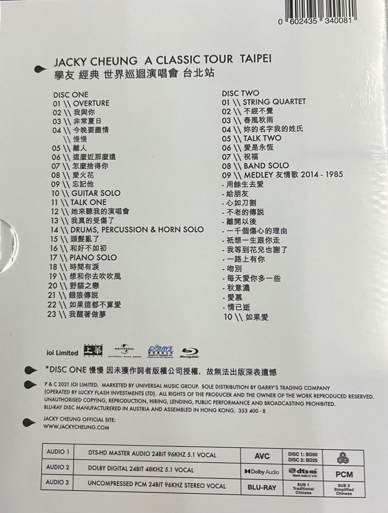 JACKY CHEUNG - 張學友 經典世界巡迴演唱會 LIVE IN TAIPEI (2 X BLU-RAY) REGION FREE